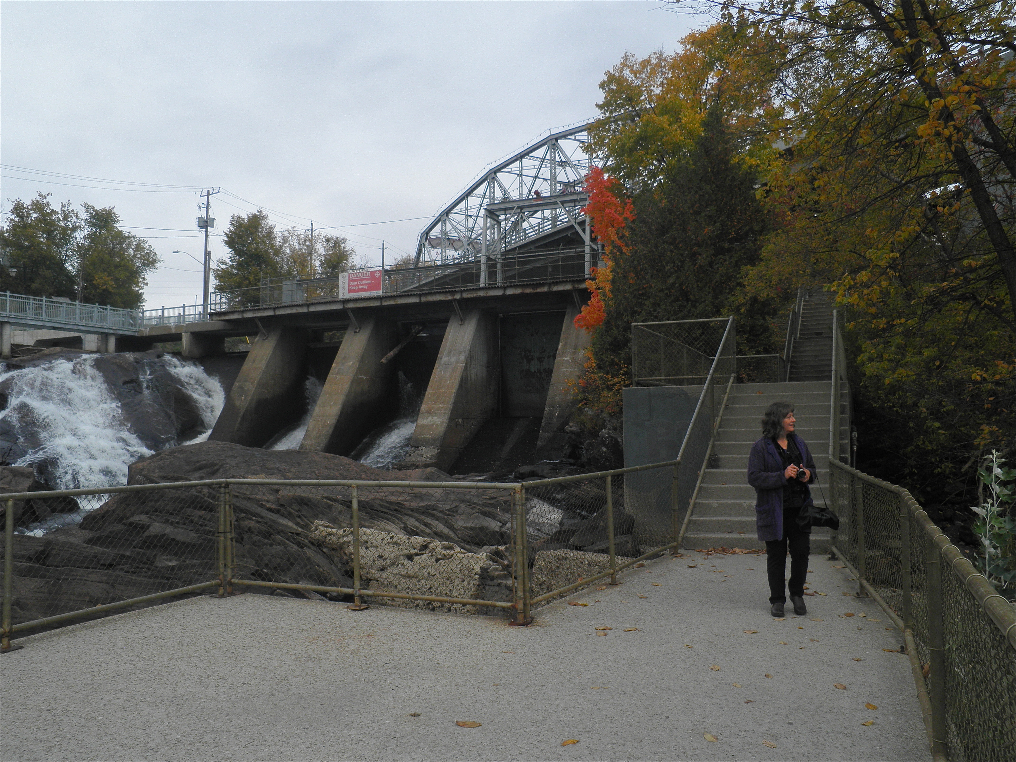 We begin the day on the road to Bracebridge. I am being the typical tourist, taking pictures of the fall colors, and highway signs with the word 'Bracebridge' on them! Mali patiently endures the stardrops in the eyes of this one who is seeing these sites for the first time. Then suddenly, there are the Bracebridge falls, and just beyond there, Rene Caisse's statue!!